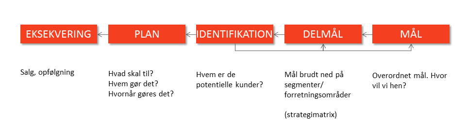 Split nu de overordnede årsmål ned i nogle delmål med størst fokus på det kommende år. Det gøres ved at identificere virksomhedens "strategimatrix". Hvilke segmenter servicerer i - og hvilke forretningsområder er I specialister i? Hvis du hører til den type virksomhed, der laver "lidt af det hele for alle mulige", så er det på tide, du laver denne øvelse, for du får et klart indblik i, om den nuværende omsætning er koncentreret indenfor få forretningsområder og/eller specifikke segmenter/store kunder.
